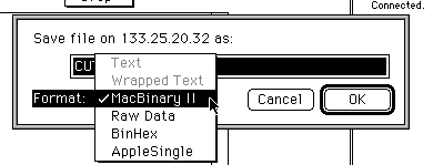 - 転送ファイル名の下の「Format」メニューから「MacBinary II」を選択すると、ファイル名に自動的に「.bin」が追加されます。そこで、「OK」ボタンを押して転送します。